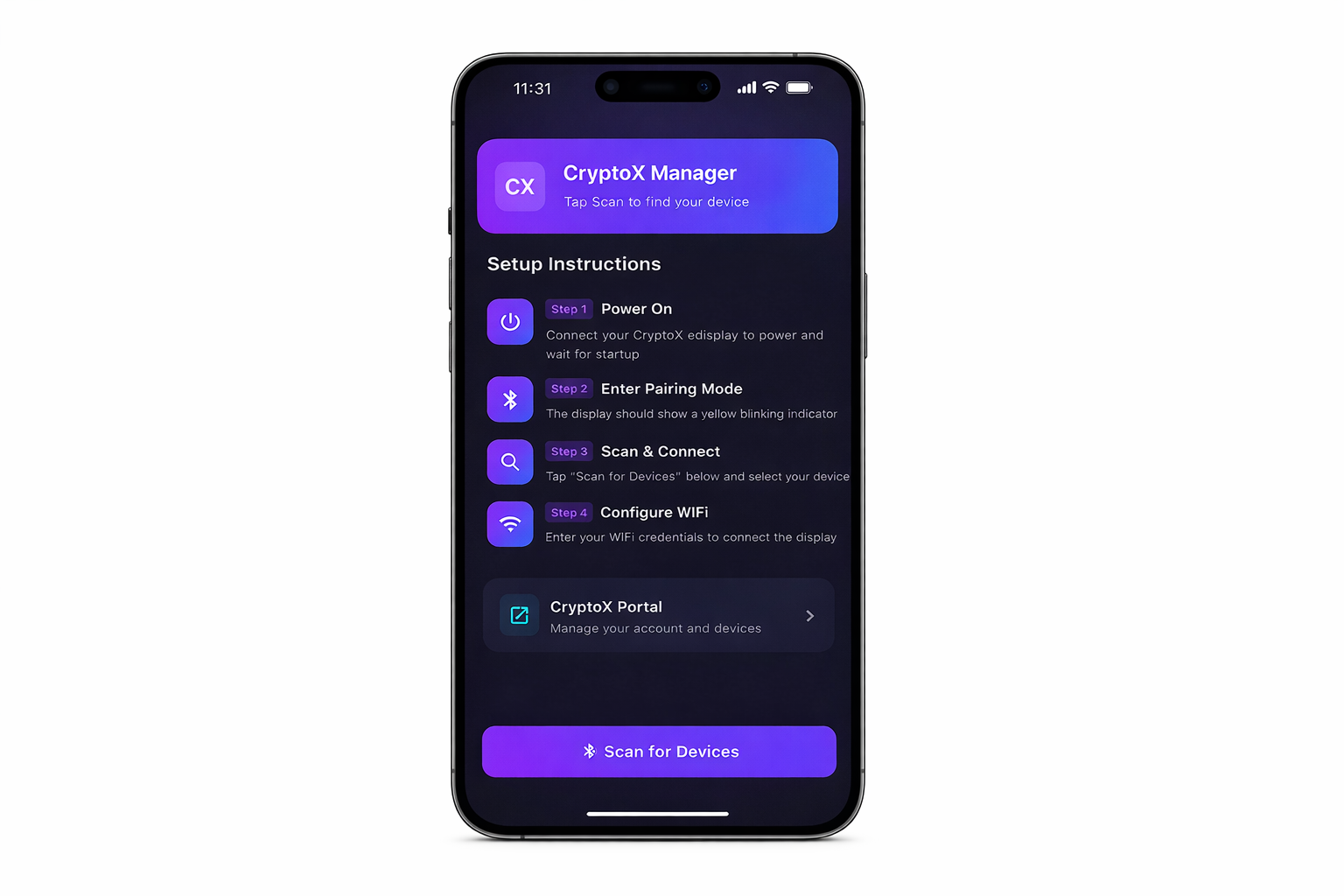 Plug in your CryptoX device, pair it, and connect to Wi-Fi — all in 4 easy steps.